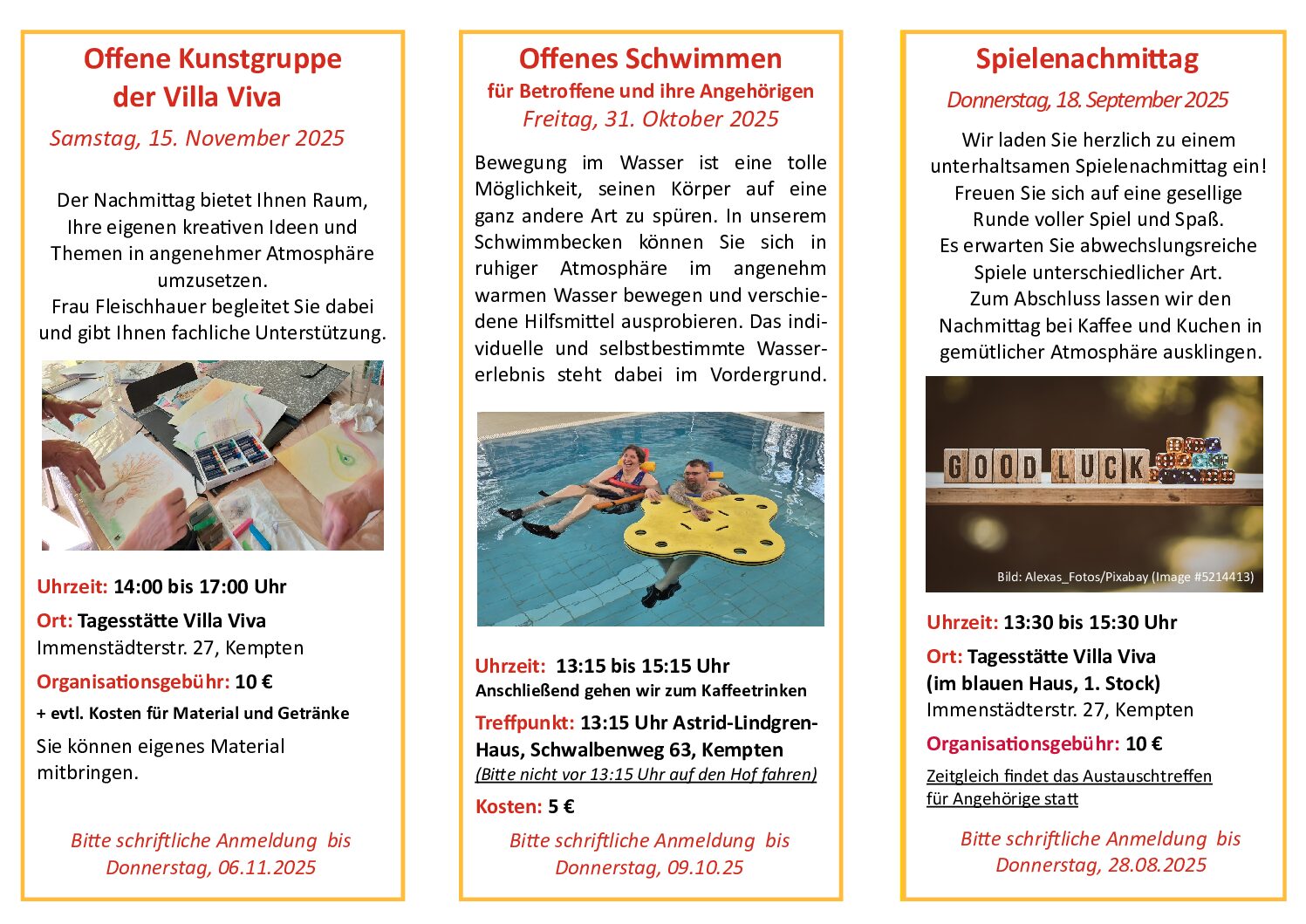 wir freuen uns, dass Sie sich für unser vielfältiges Freizeit- und Begegnungsangebot für Menschen mit erworbener Hirnschädigung und deren Angehörige interessieren. Sie sind herzlich eingeladen, an den Ausflügen, dem Offenen Malen und am Offenen Schwimmen teilzunehmen.