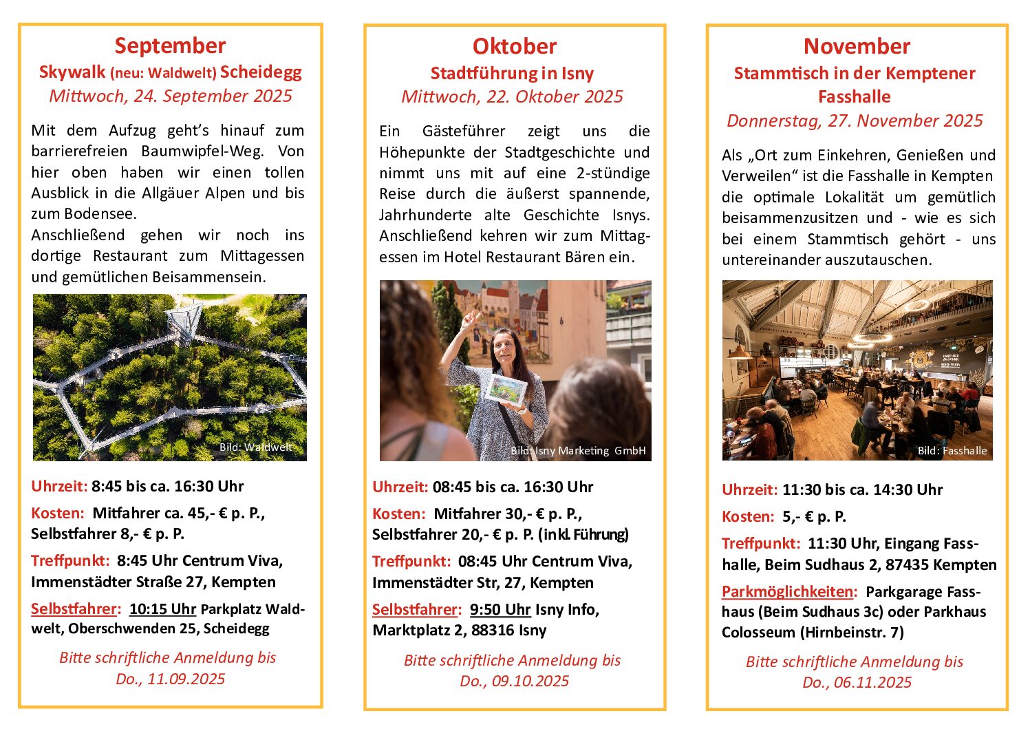 Je nach Veranstaltung fallen verschiedene Kosten an (z. B. Eintrittsgelder, Fahrtkosten, Parkgebühren, etc.). Für Mitfahrer in unserem Bus/ PKW sind diese mit eingerechnet.